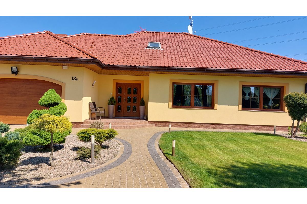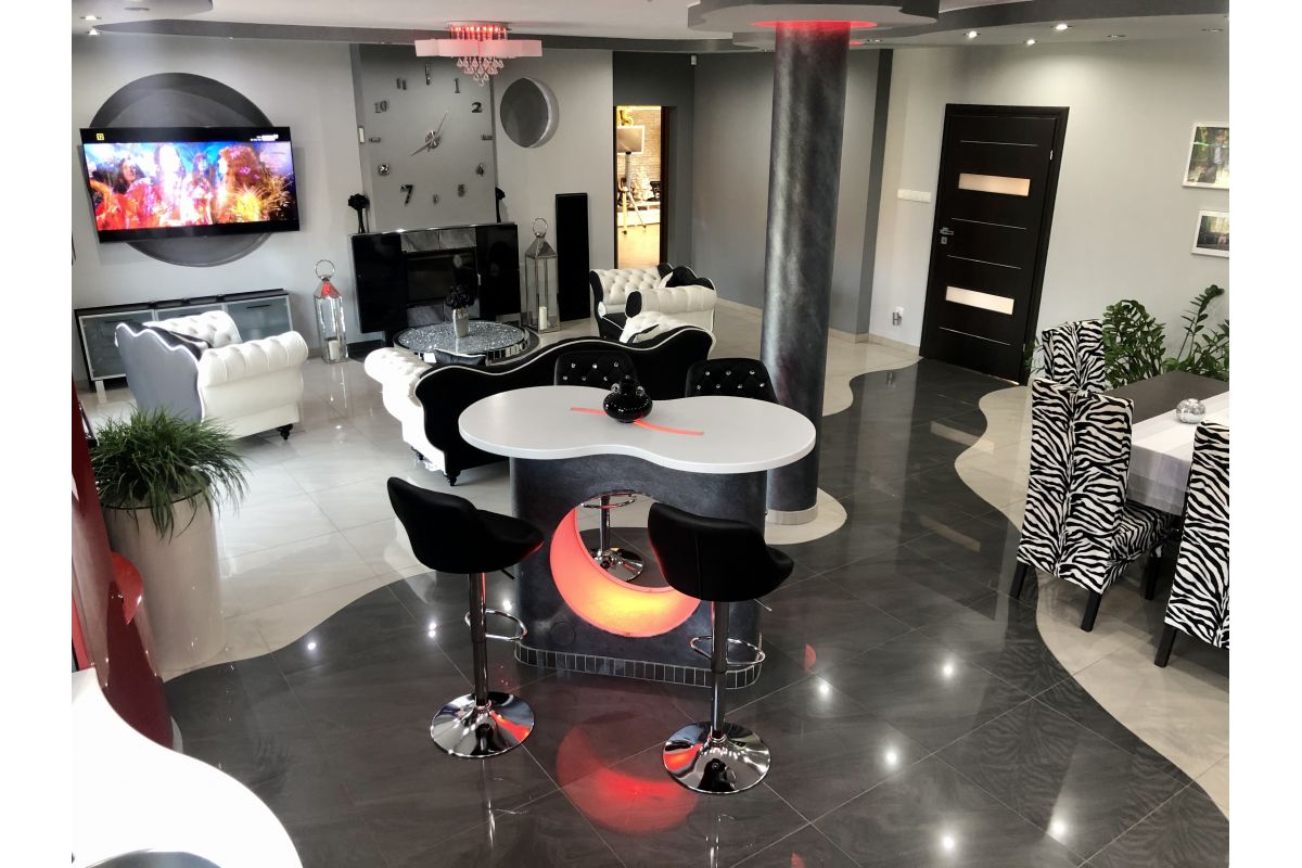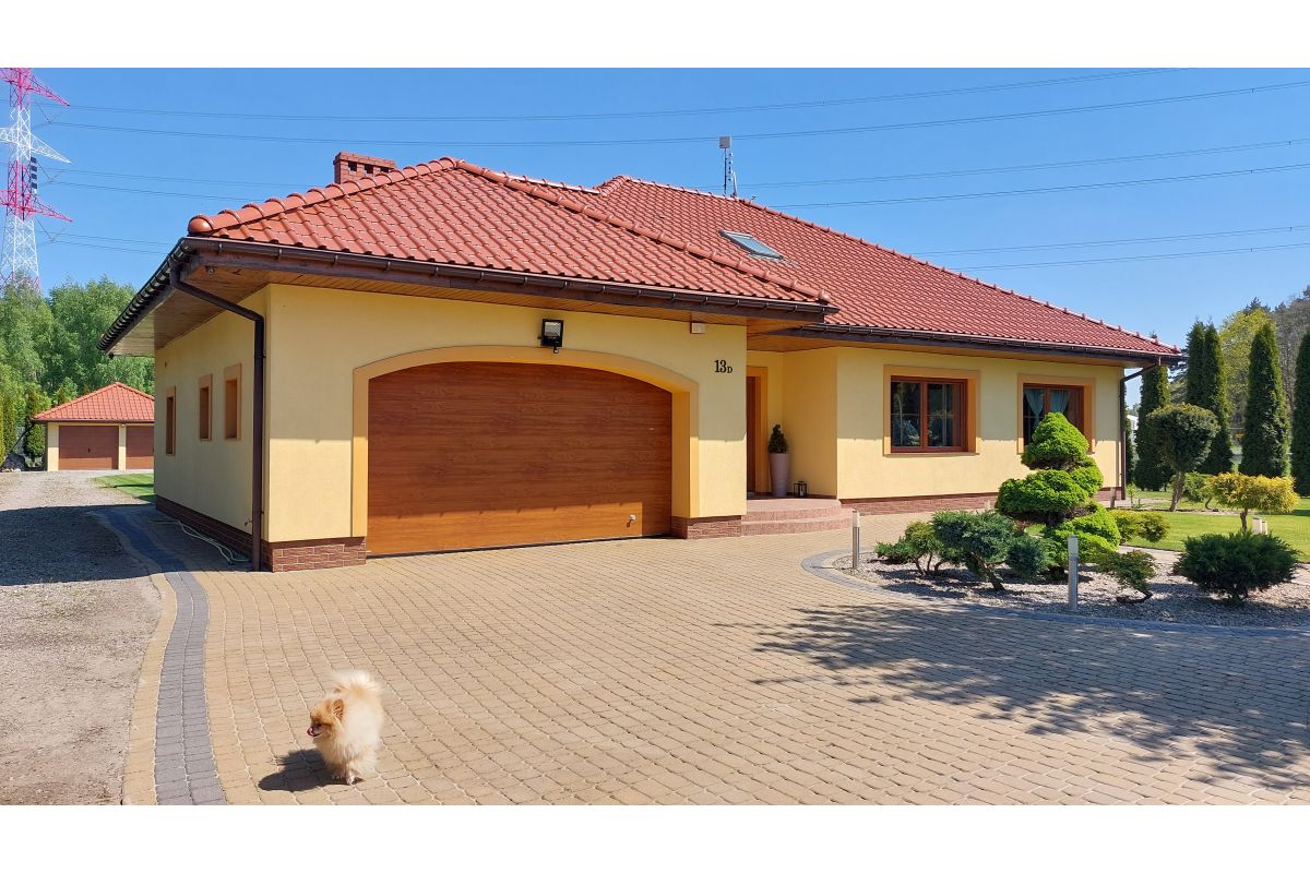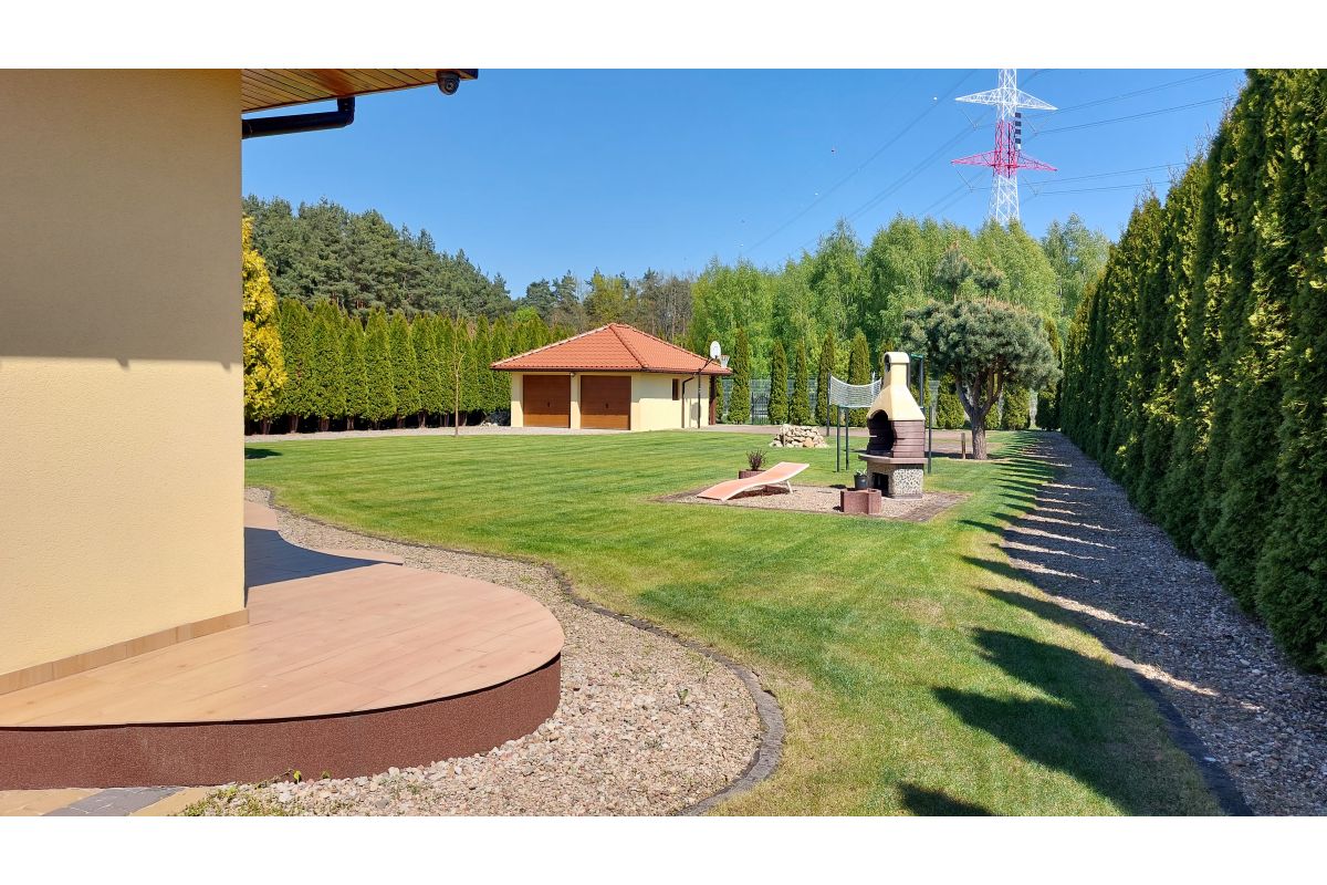 Dom dla wymagających - nowoczesne i oryginalne wnętrza, z salonu wyjście na duży taras (52 m2) z widokiem na las, boisko do siatkówki i koszykówki wyłożone kostką brukową, 2 systemy ogrzewania: pompa ciepła i ogrzewanie kominkowe z dystrybucją ciepłego powietrza na wszystkie pomieszczenia domu, klimatyzacja, przydomowa oczyszczalnia ścieków, woda miejska + własna woda do podlewania ogrodu, automatyczny system nawadniający, monitoring zewnętrzny z podłączeniem do Internetu, zdalnie sterowany system alarmowy z GPRS,  automatyczne bramy, niemiecka dachówka ceramiczna Koramic, okna pcv w pakiecie trzyszybowym, rolety zewnętrzne, niemieckie drzwi wejściowe firmy OBST z ciepłego aluminium z wypukłym antywłamaniowym szkłem, gięta lakierowana kuchnia z systemem TIP-ON, w jadalni stół bilardowy z nakładkami tworzącymi stół biesiadny. Inteligentny dom.